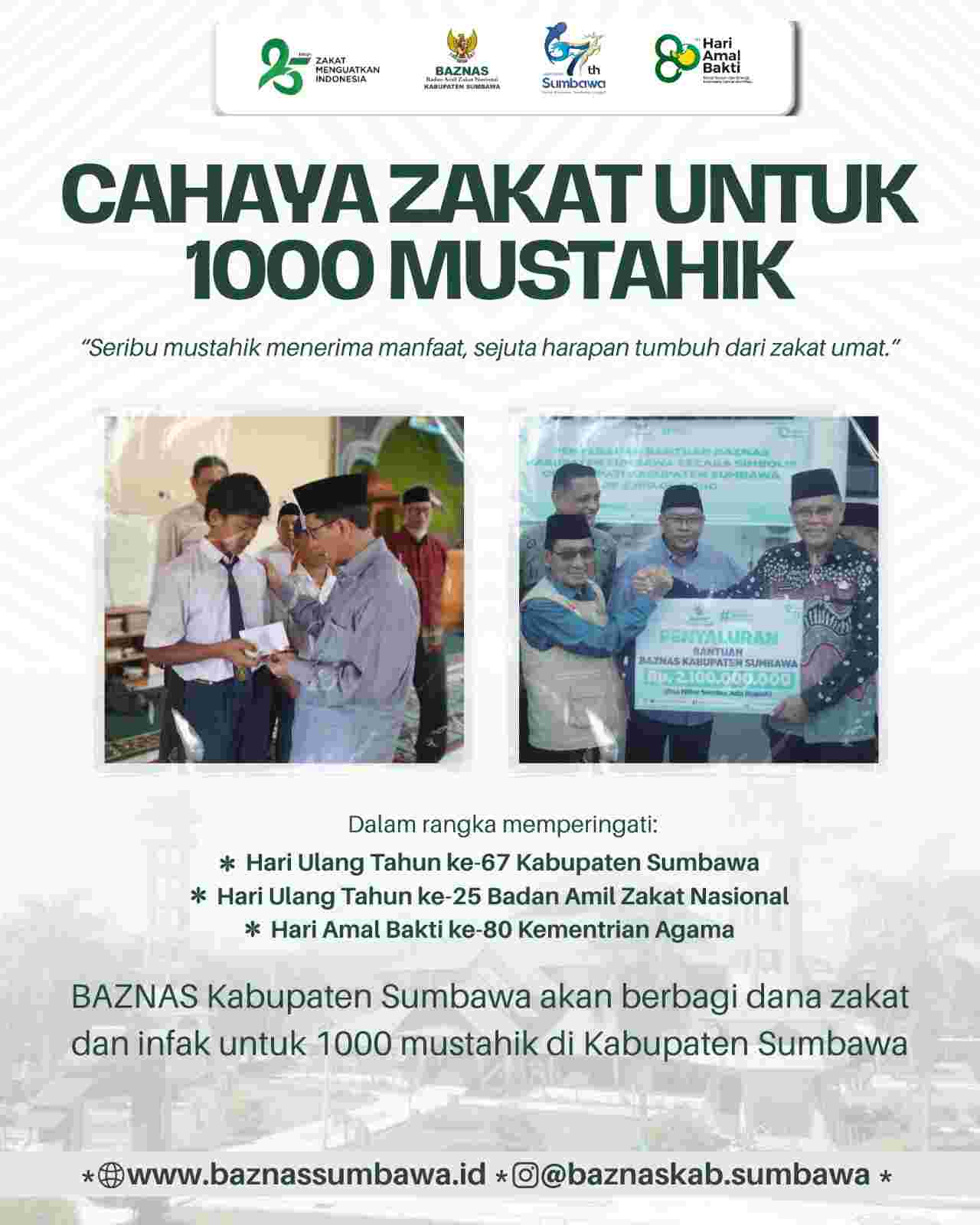 Dalam rangka memperingati Hari Ulang Tahun (HUT) BAZNAS ke-25, BAZNAS Kabupaten Sumbawa akan menyalurkan zakat, infak, dan sedekah kepada 1.000 mustahik pada hari Senin, 20 Januari 2026, bertempat di Masjid Agung Nurul Huda, Kabupaten Sumbawa.