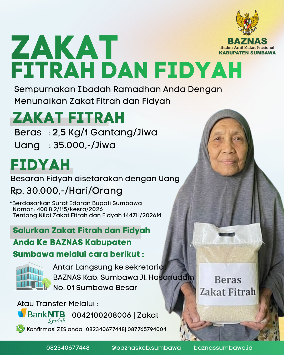 Penetapan besaran zakat fitrah dan fidyah ini mengacu pada Surat Edaran Bupati Sumbawa Nomor: 400.8.2/115/kesra/2026 tentang nilai zakat fitrah dan fidyah tahun 1447 H / 2026 M.